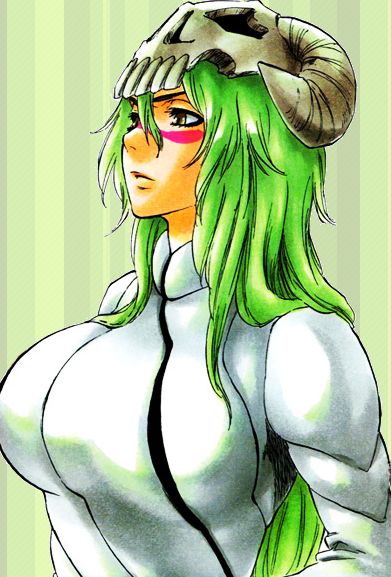 4. Внешность (подробное описание и картинка) В нормальном состоянии Нэриэлл взрослая женщина с зелёными длинными волосами. Обычно на лице арранкара можно увидеть беззаботную детскую улыбку, но стоит ей вступить в битву она становится серьёзной. На лице у неё красная или скорее розовая полоса прямо под глазами, которая начинается в одном углу глаза и заканчивается в другом. Также на лице можно заметить стигму (шрам) от поломанной маски. Глаза у неё серые с незаметным оттенком зелёного. Цвет кожи у неё нормальный, не бледный, но и не загорелый. Маска пустого находится на голове, она выглядит как череп какого-нибудь горного оленя с загнутыми рогами и обломанными зубами. На спине Нэриэлл есть татуировка, изображающая её номер в эспаде «3». Когда Нэриэлл была в эспаде, она носила белую форму, как и все арранкары, белая обтягивающая куртка с длинным рукавом и белые, немного расклешённые брюки с разрезами с двух сторон на голени. Из обуви бывшая эспада предпочитает белые полусапожки на небольшом каблуке. Сейчас же она одета в короткую грязно зелёную юбку и такой же топ с небольшими как у футболки рукавами и горлом как у свитера. К ремню брюк прикреплён занпакто с зелёным футляром, рукоять у катаны также зелёная, а гарда бежевого цвета. В релизе она становится кентавром с зелёной шерстью и чёрным хвостом, маска на голове становится немного больше. На руках некое подобие рукавиц, а в руке она держит двустороннее большое копьё.